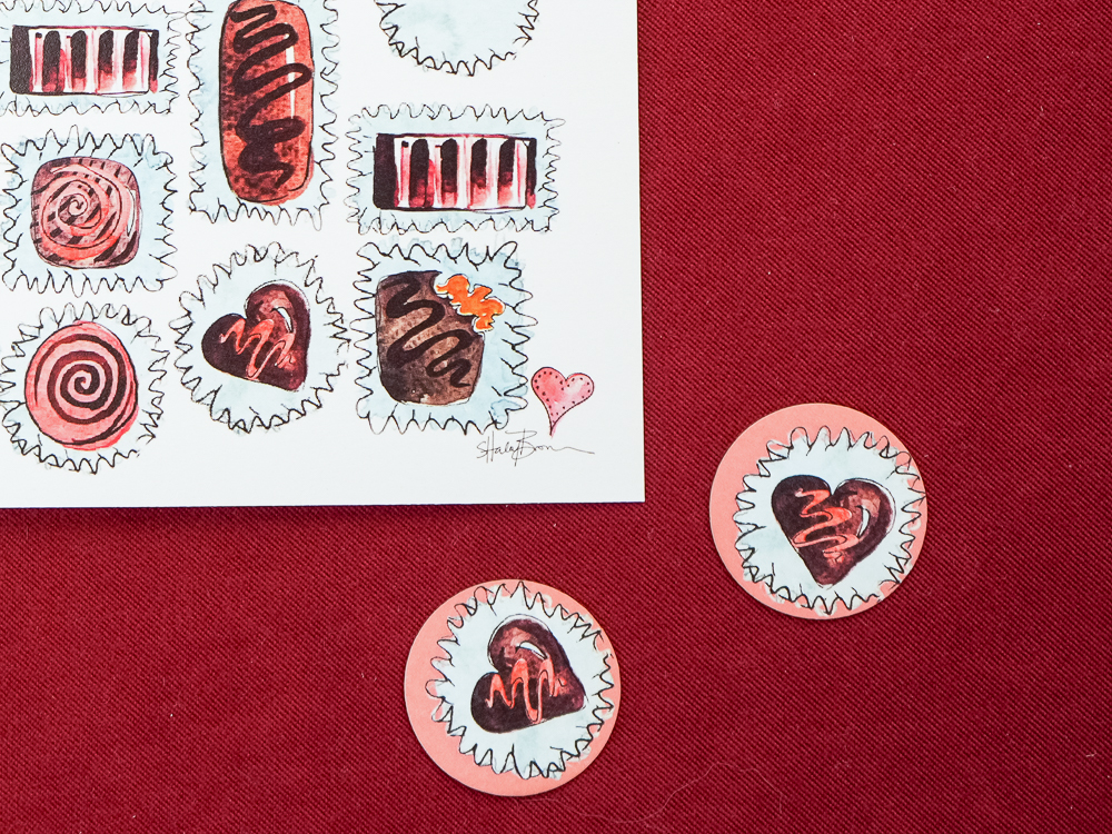 Haley’s Valentine’s design is all about boxes of chocolate and whimsical little sweets the day is filled with. The decorative top of a gourmet box, chocolates with intricate drizzles inside, and even the die cut pieces of chocolate, all represent the sweetness of a Valentine’s Day gift.