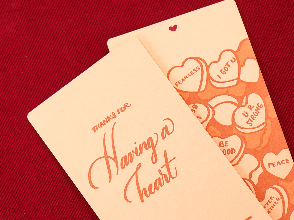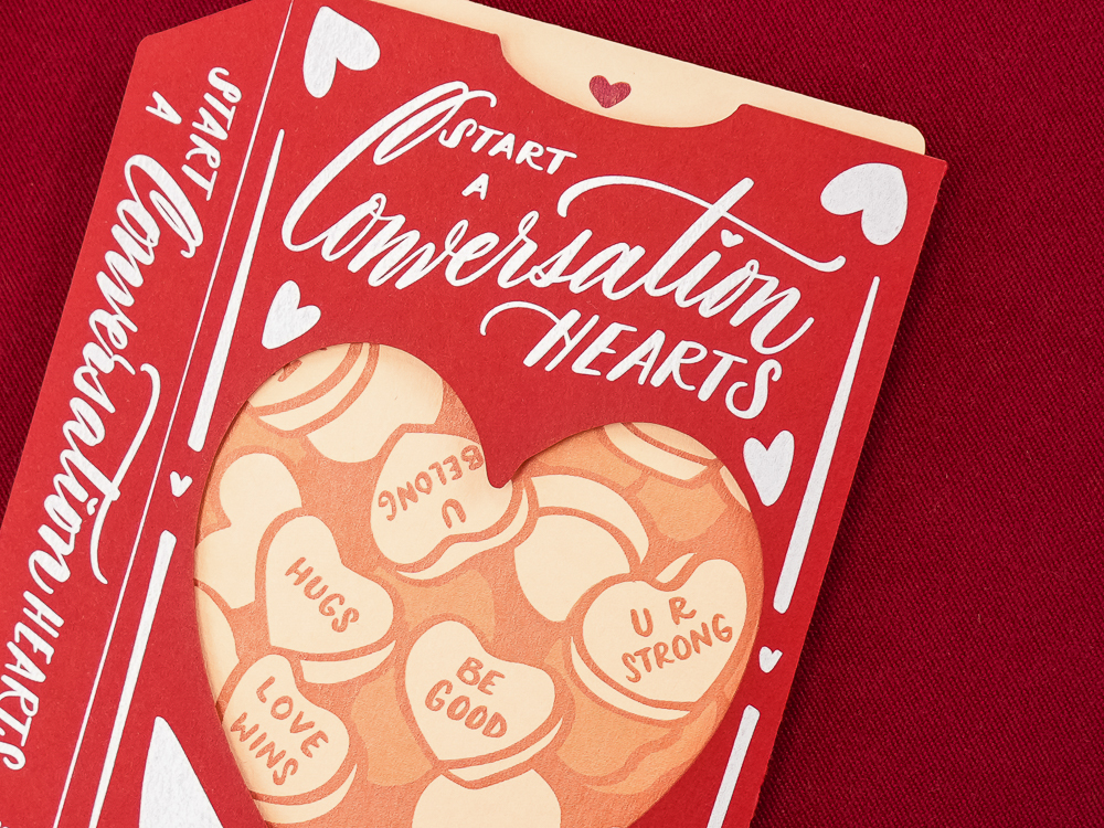 “I love holidays, and I especially love ones where stationery is a prominent element. Since grade school, I’ve always loved Valentines and the novelty of tiny paper goods. With that spirit, I wanted to create a design where the messaging was more friend-focused than romantic – for maximum shareability. It’s difficult at this time to create anything that doesn’t have some reflection on our collective cultural mood. I used the iconic conversation hearts box as a prompt (“Start a conversation”) while the heart candies have messages of love, hope, and recognition (“Be Good”, “You belong”, “Love wins”, etc.). The message on the back of the card insert says “Thanks for having a heart”, a sentiment that’s not taken for granted. It’s lovely to see artists creating joy and participating in community. Thank you for creating the opportunity C&P.”