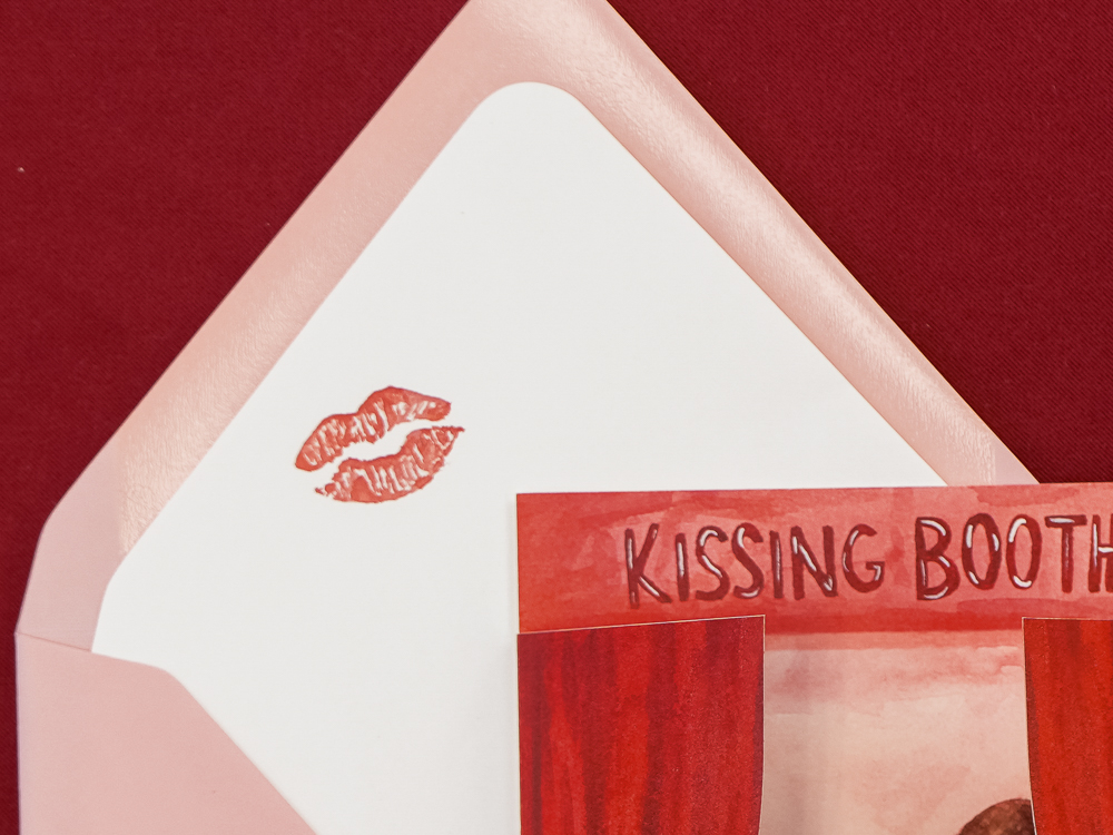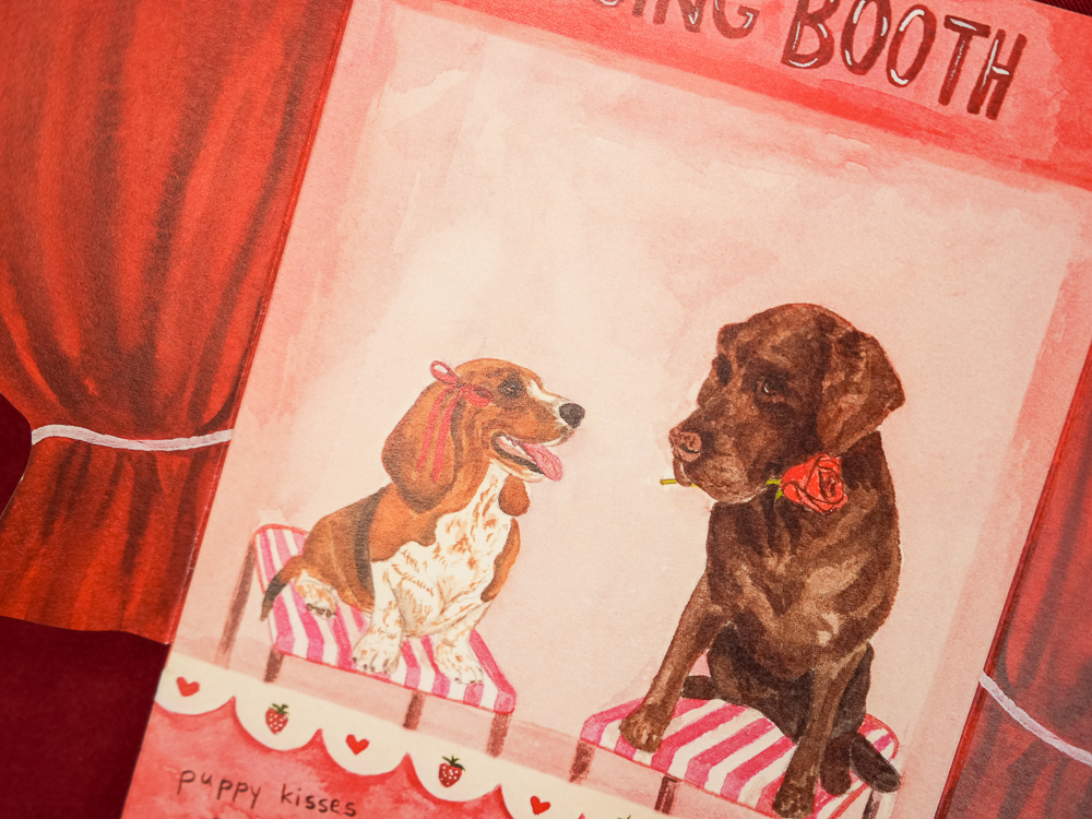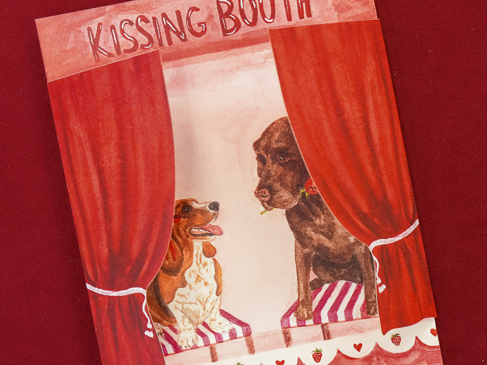 “My watercolor design was inspired by a classic carnival kissing booth! I wanted it to feel interactive, magical, and colorful! I loved the idea of creating a theatrical reveal with curtains, with the dogs peeking through and then opening to a lighthearted, sweet moment. I love when a card holds a surprise inside!