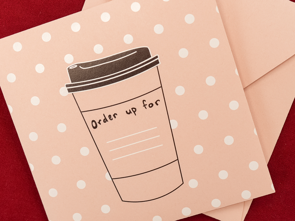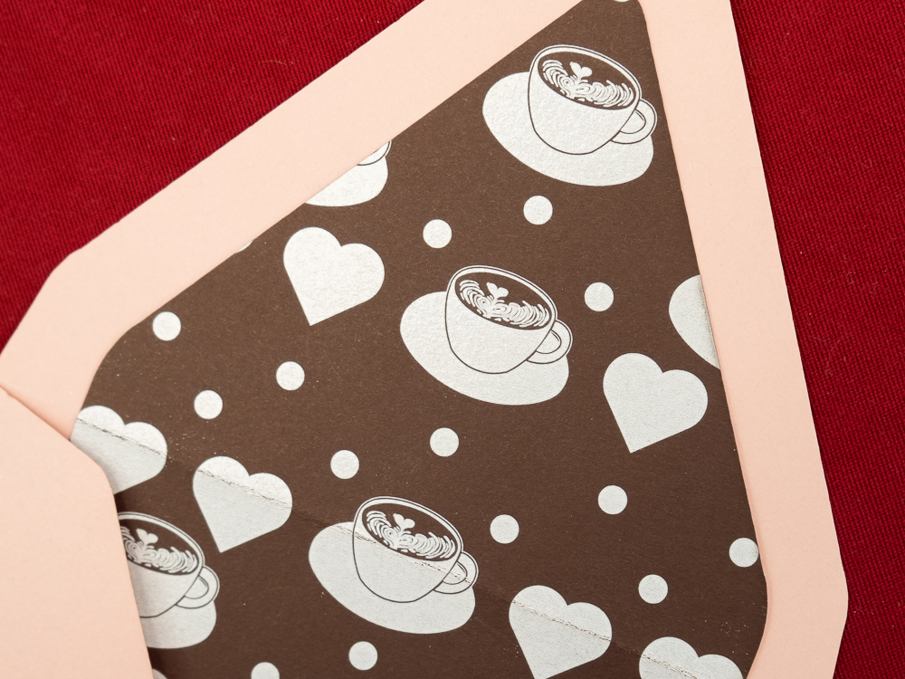 Britney Morgan went full coffee shop with this design… and we mean every piece. She created custom everything, from a latte-art envelope liner with hearts and coffee cups to a card designed to look like a to-go cup where you write the recipient’s name. The standout is the spinner: a laser cut circle with a heart-shaped border that reveals a different coffee-themed love pun each time you turn it. Britney used both white and colored printing to pull it all together, and it’s the kind of valentine you keep spinning just to see what comes up next.