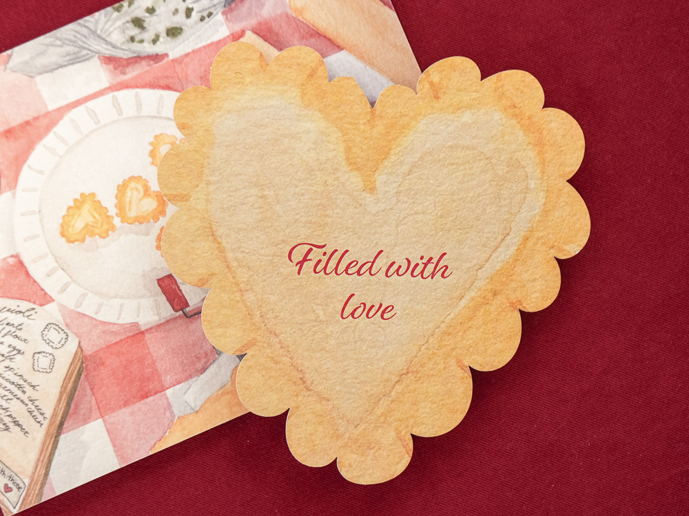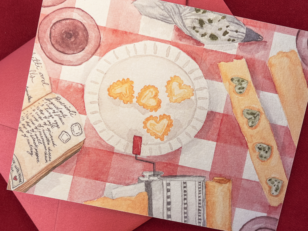 “‘Filled with Love’ was inspired by a pasta-making night with friends and family. The original watercolor recipe card was inspired by an evening of wine, pasta, and laughter in the kitchen. I wanted to capture the feeling of sharing food and time together. The quiet intimacy of cooking side by side and passing down cherished recipes. To me, love lives in those small, intentional moments.”