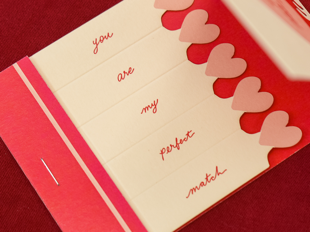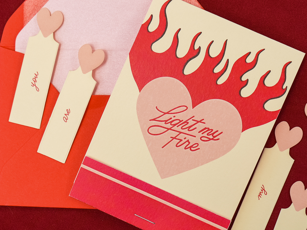 “My design inspiration came from an illustration I had drawn for fun. I love match books and collect them from places I visit and estate sales. I drew the “light my fire” lettering and matchbook one day when I was drawing and loved the design but never had any real use for it. I even looked into making real matches but the minimums were crazy! Haha When I saw your contest I thought it would be the perfect way to bring the matches to life! I love love and all things Valentine’s Day and was super excited to create something to celebrate!”
